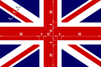 However, the army's version of the flag is not 1:2 but 3:5, so the two values of 25 along the bottom edge would be 20. In this case the diagonals of the St Patrick's cross are not quadrilaterals and are cut off as shown above. This is not a mistake - it is simply a result of the geometry. Both the 1:2 and 3:5 versions are official (although the government uses 1:2) and their specifications are given in BR20 Flags of All Nations, the British government's flag book.