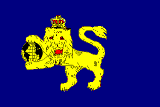 blue rectangular flag bearing a gold lion rampant, crowned holding a globe.