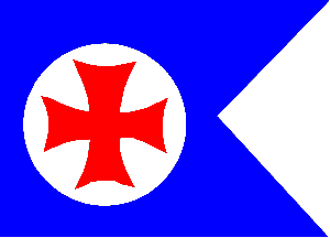 rectangular flag with a narrow white cross. In the centre, there is a