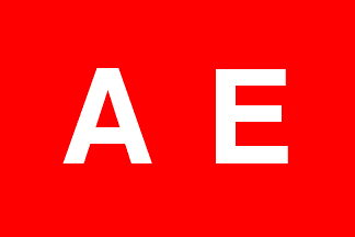 horizontal strips at 1/3 and 2/3 of flag height; in the center a white capital