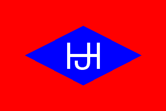 Cardiff (Wales), as red with a blue diamond charged with a white "JH" cypher.