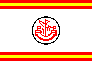 distinctive red flag with two white vertical stripes, forming five equal bands.