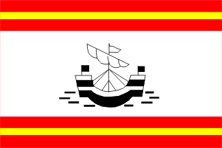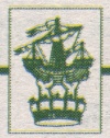bars at top and bottom, black outlined sailing ship with sails furled.