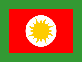 The flag has a red field with a broad green border, in the centre a white disk bearing a
