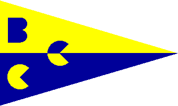 The burgee of BCC is horizontally divided yellow-dark blue with the letters B