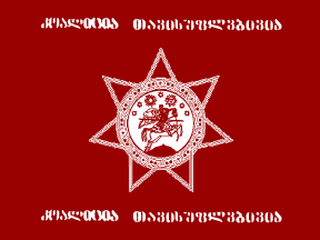 The flag is red with the former national emblem of Georgia, countercharged inside the centralring and flanked on top and bottom by writings in Georgian script - the same inscription above and below.