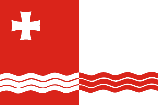 The flag must have been derived from the municipal coat of arms, "Per fess 1. Gules in chief a cross patty argent, 2. Argent, overall three bends sinister wavy countercolored. The shield surmounted by a three-towered mural crown argent fimbriated sable. Under the shield a scroll argent