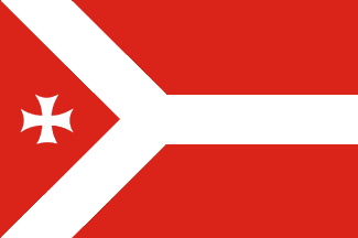 The flag is red with a white division shaped as an horizontal "Y" and a white "Georgian" cross patty in the hoist's triangle.