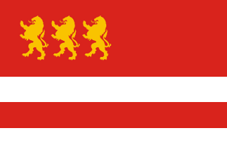 The flag of Marneuli is horizontally divided red-white-red-white (3:1:1:1) with three yellow lions in canton.