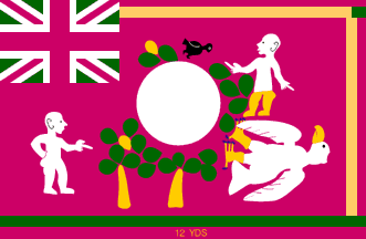 Square union jack canton, taking almost all the upper hoist pink panel, with black background (or just very dark blue?) and large St. George cross in dark red. This flag includes the usual wide border made of large squares of contrasting colors on all three free sides, consisting of dark red, white and black squares in this order, from the top hoist.