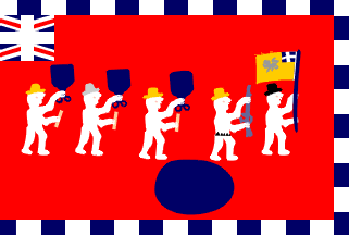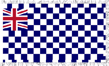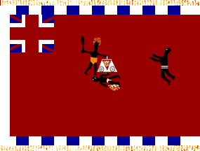 The canton is filled with a squarish union jack fairly well depicted. A border on all free sides, as usual not enclosing the canton, is made of white triangles pointing out side and touching each other.