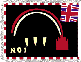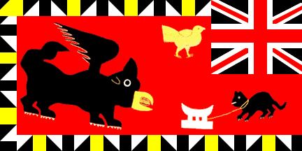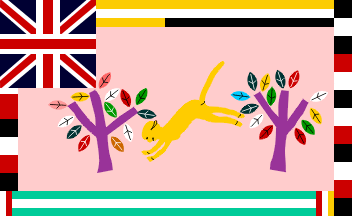 Keywords: border (multicolor) | canton: union jack | nºi | crocodile (black) | dragon | nº2 | trumpet | megaphone | chick | anvil | cat (black) | chequy 16×9 | chequy (white-blue) | monkey | trees: 2 | tree (purple) |
