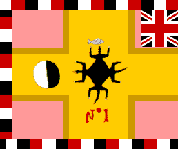 The flag is pink with a very wide golden yellow cross throughout, with a tan fimbriation. On the center of the cross, two black crocodiles (?), seen from above, crossed over each other: facing respectively top and fly, the former holding a small silver fish on its mouth. On the fly-side arm of the cross, a large disc divided vertically in white and black (white flywards), standing for the Moon. On the bottom arm of the cross "NºI" in red.