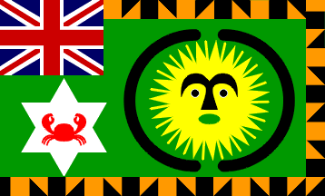 An excellent Asafo flag, colorful yet not garish, halfway between naive and elegant: Green cloth with a large yellow sun on the main area, complete with facial features (strong nose and brows, in black, white-edged black eyes, green oval mouth) and 38 rays, alternating thick and thin, and enclosed between two black semi-circular arches (just like a pair of round brackets). On hoist side, below the (fairly well-depicted) union jack canton, a large white six-pointed star with a red crab on it. Border on all three free sides, consisting of alternating black and orange squares: black, diagonally orange and black, orange, diagonally black and orange.