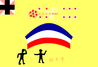 Above the human figure on the hoist side and below the canton, two bright light blue “ovals” (not ellipsis, rather two discs joined by parallel tangents), which I presume to be clouds or puddles. White fringe around all the three free edges and canvas sleeve along the hoist.