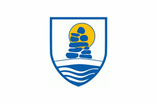 charged with inuit stone-emblem, a yellow sun, and blue wavy stripes