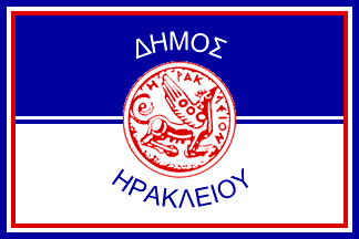 The Kokkonis website shows a variant of the second flag, with a darker blue field, the more elaborated seal of the first flag, a different font for the words ΔΗΜΟΣ ΗΡΑΚΛΕΙΟΥ, and an outer, blue-white-red thin border.
