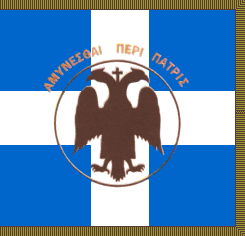 The yellow writing above the circle reads ΑΜΥΝΕΣΘΑΙ ΠΕΡΙ ΠΑΤΡΙΣ (Fight for the Fatherland).