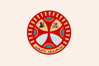 The flag with the 1999 emblem is very light pink with the former municipal emblem in the center (Kokkonis website).