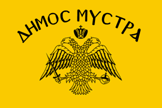 The flag of Mystras (Kokkonis website) was yellow with a Byzantine eagle and the name of the municipality.
