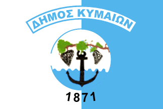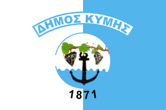 The flag of Kymi is vertically divided white-light blue. In the middle is placed the municipal emblem, beneath the year "1871", above the name of the municipality, written either "ΔΗΜΟΣ ΚΥΜΗΣ" (photo) or "ΔΗΜΟΣ ΚΥΜΑΙΩΝ" (photo).