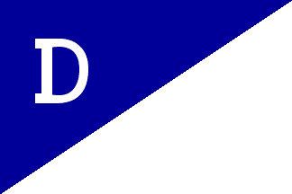 The house flag of Empros, as shown by Josef Nuesse and, graphically, on the company website, is divided blue-white by an ascendant diagonal and bears a white "D", for Dracopoulos, in canton.