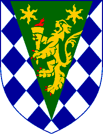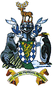 Lozengy Azure and Argent, a Pile Vert thereon a Lion rampant Or holding a Torch also Or, enflamed proper between in chief two Estoiles Gold, and for the Crest upon a Helm with a Wreath Argent and Azure, upon a Mountain proper of four Crests each tipped Gules, a Reindeer statant and at gaze proper; Mantled Azure doubled Argent and for the Supporters: Dexter a Fur Seal proper and Sinister a [Macaroni] Penguin proper, the compartment per pale rock and ice proper overall a (tuft of grass) [Bend of Grass] [also] proper together with this Motto LEO TERRAM PROPRIAM PROTEGAT.