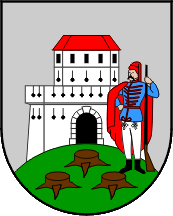 The coat of arms of the Town of Bjelovar is the historical coat of arms, in shape of a silver, white shield. On a green hill with three brown stumps stands a white rectangular fort with embattlements, loopholes and opened oval doors, in front of which, on the left it is standing a serežan holding a rifle. The fort is topped by a building with loopholes and windows, and with a red roof.