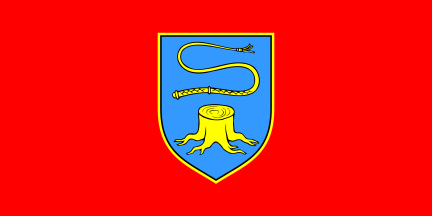 The flag is in proportions 1:2, red with the coat of arms, bordered yellow, in the middle.