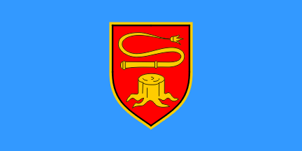 The coat of arms is "Azure a whip embowed-counterembowed or and in base a stump eradicated also or".