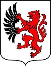 The coat of arms is "Argent a lion rampant gules holding with his front paws a wing sable".