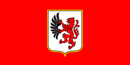 The flag is in proportions 1:2, red with the coat of arms, bordered yellow, in the middle.