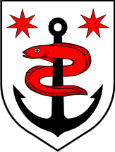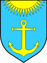 The coat of arms of Ploče is "Azure an anchor or and a sun in