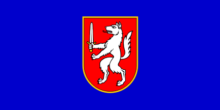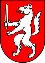 The administrative approval simply says "in red a silver/white marching wolf holding a sword" (Gules a wolf rampant or holding a sword.