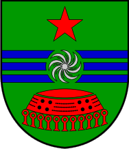 The coat of arms was "Vert three barrulets azure superimposed with a rotational symbol argent, in chief a mullet of five gules and in base a Japodić helmet also gules".