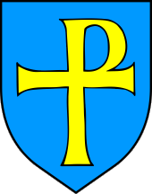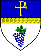The coat of arms has a heart shape divided with a wattled bar in two fields.