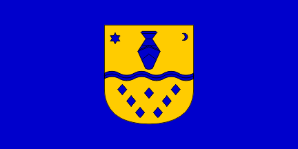 The flag is in proportions 1:2, blue with the coat of arms in the middle.