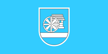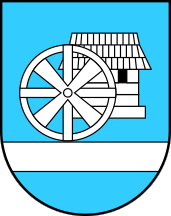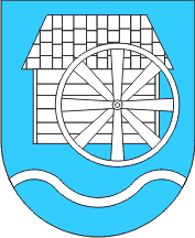 The coat of arms is described in Article 5 of the Decision, as " In blue over a silver (white) bar a silver (white) water mill."
