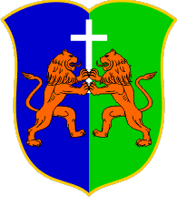 ... in shield shape, divided vertically into two fields joined with a white cross. The outer edge is golden (yellow). The left half of the coat of arms is blue and the right half is green (coloured). The coat of arms is dominated by two griffins looking at each other, coloured orange, this being a combination of symbols found in the arms of the Patačić and Gotal families, who lived and owned castles and lands on the territory of the current Municipality of Budinščina.