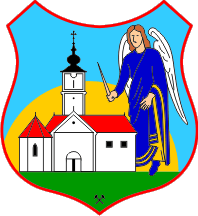 ... in a slightly narrowed shield, with a white horizontal bar divided in two fields. The background of the top field is the Croatian historical coat of arms with hatched red and clear white fields, and the bottom field is green with the mining symbol above the bottom peak of the shield. On the white bar is a semicircle coloured orange symbolizing the sun. On the described bacground in the right is a figure of St. Michael Archangel with wings, clad in a dark blue cape and light blue habergeon, with a flaming sword in its right hand. To the left of him is the drawing of the old Baroque church of Mihovljan, destroyed in the Second World War, with red roof and black dome at the tower. The coat of arms is bordered with a yellow edge of the colour of the sun semicircle. In the semicircular indentation at the top of the shield is a ribbon coloured light blue with ends in the colours of the Croatian flag and with the inscription "Mihovljan".