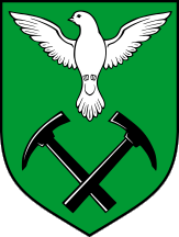 The coat of arms is: "Vert a dove displayed argent in base two miner's hammers sable in saltire". The dove (in Croatian, golub, more correctly "a pigeon") makes the arms canting and the two hammers remind the coal mines that brought prosperity to Golubovec until closed more than 30 years ago.