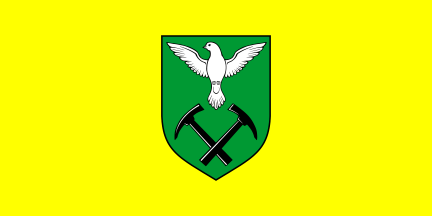 The ceremonial flag, not mentioned in the Decision, which is not unusual, is a yellow gonfanon with three rectangular tails containing green oak ornaments, the coat of arms in the middle and the name of the municipality in green letters above. The use of green for lettering is quite unexpected, but matches the design nicely.