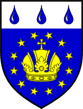 The coat of arms of Tuhelj is "Azure an Imperial crown or between twelve stars in an annulet and in a chief argent three gouttes de larmes".