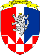 The emblem is a shield with three vertical fields, red, white and blue with a red-white chequered base and a silver lion overall. Atop the shield is a yellow ribbon inscribed "ČEŠI V REPUBLICE CHORVATSKO / ČESI U REPUBLICI HRVATSKOJ" ("The Czechs in the Republic of Croatia" in Czech and Croatian language, respectively).
