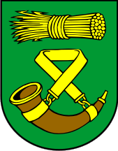 The coat of arms is "Vert a hunting horn proper and in chief a sheaf fesswise or".