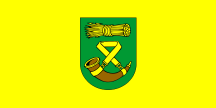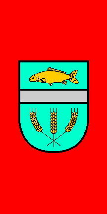 The table flag is nearly identical to the ceremonial flag. The municipality also uses a rectangular flag, vertical with the coat of arms topped with brown inscriptions in two lines (photo).