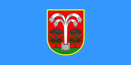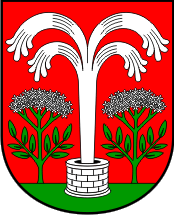 The coat of arms is "Gules a fount forming four spots issuing from a masoned well argent on a base vert between two elder trees vert flowered argent".