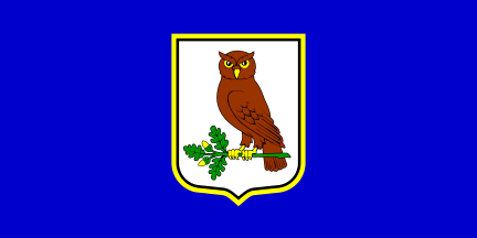 The flag is in proportions 1:2, blue with the coat of arms, bordered yellow, in the middle.