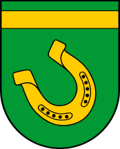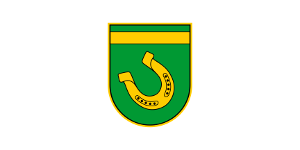 The coat of arms is prescribed in Article 2 of the Decision as "In a green field a yellow horse-shoe set obliquely topped with a yellow beam" ("Vert a horse-shoe or fesswise in chief a bar of the same").