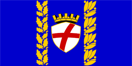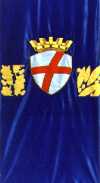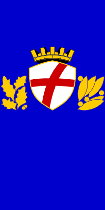 The flag, which is hoisted on the Town Assembly and few other sites in the town, as seen in 2001 and 2003, is in proportions 1:2, blue with the coat of arms in the middle; atypically, this is bordered with two columns of golden ornaments, oak leaves and acorns at hoist and laurel at fly.* The word stijeg used in the Croatian title of the Decision is obviously meant to match the Italian word gonfalone. The word I>stijeg is usually interpreted to mean "standard" (both have roots meaning "to stand"). In Croatian decisions of this kind, the gonfalon is usually named svečana zastava (ceremonial flag) or gonfalon. I can not remember any other local entity using the word stijeg for this kind of flag.
